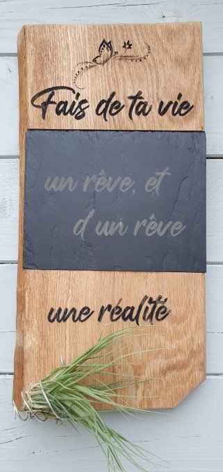 Planche décorative en bois et ardoise. Gravure laser personnalisable. Véritable plante presque sans entretien "Tillandsia" Dimension 40 x 25cm environ. Préciser la citation que vous souhaitez en commentaires