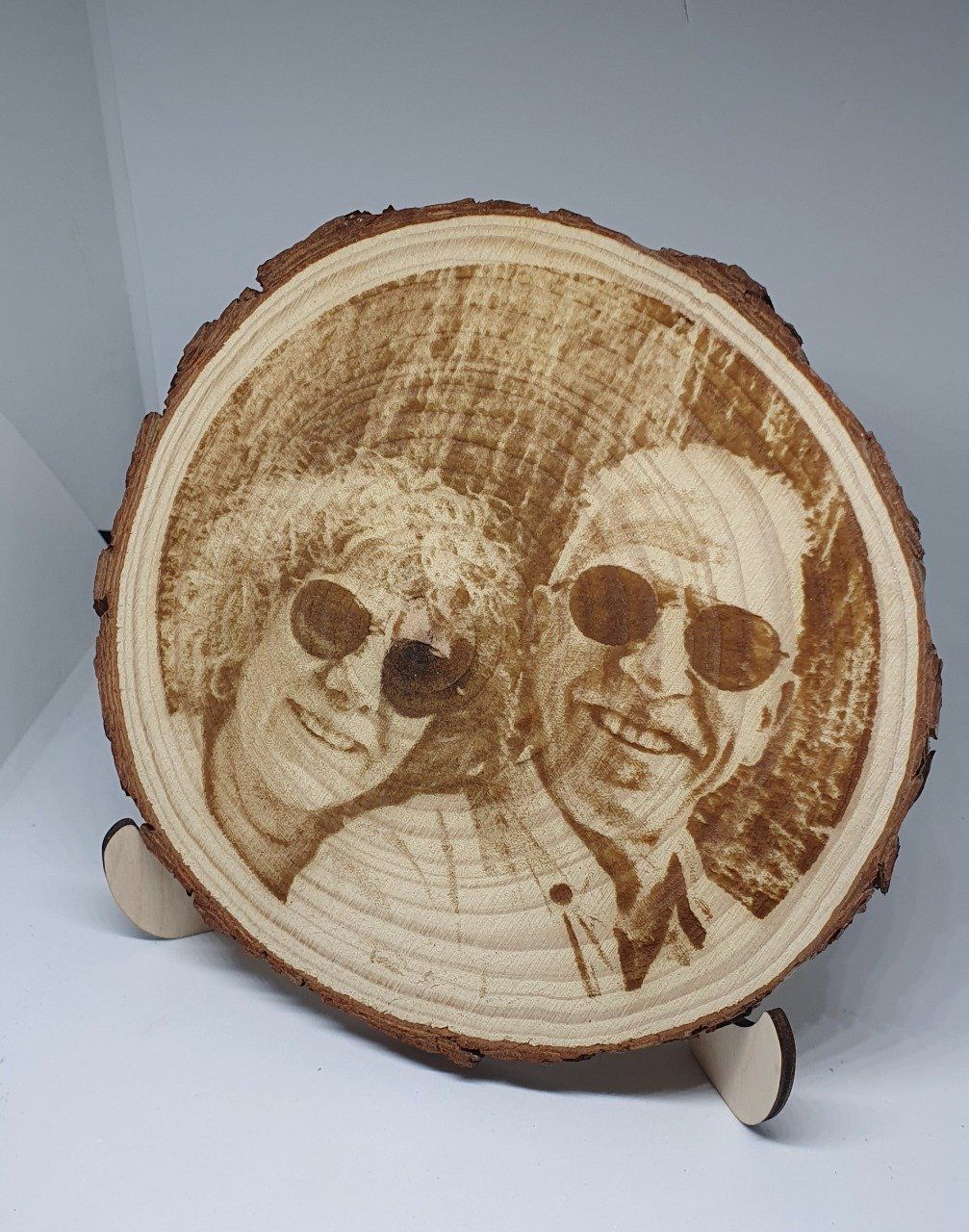 Gravure photo sur une tranche de bois diamètre 15cm. Livré avec son support.