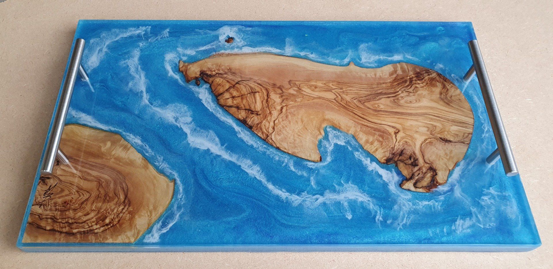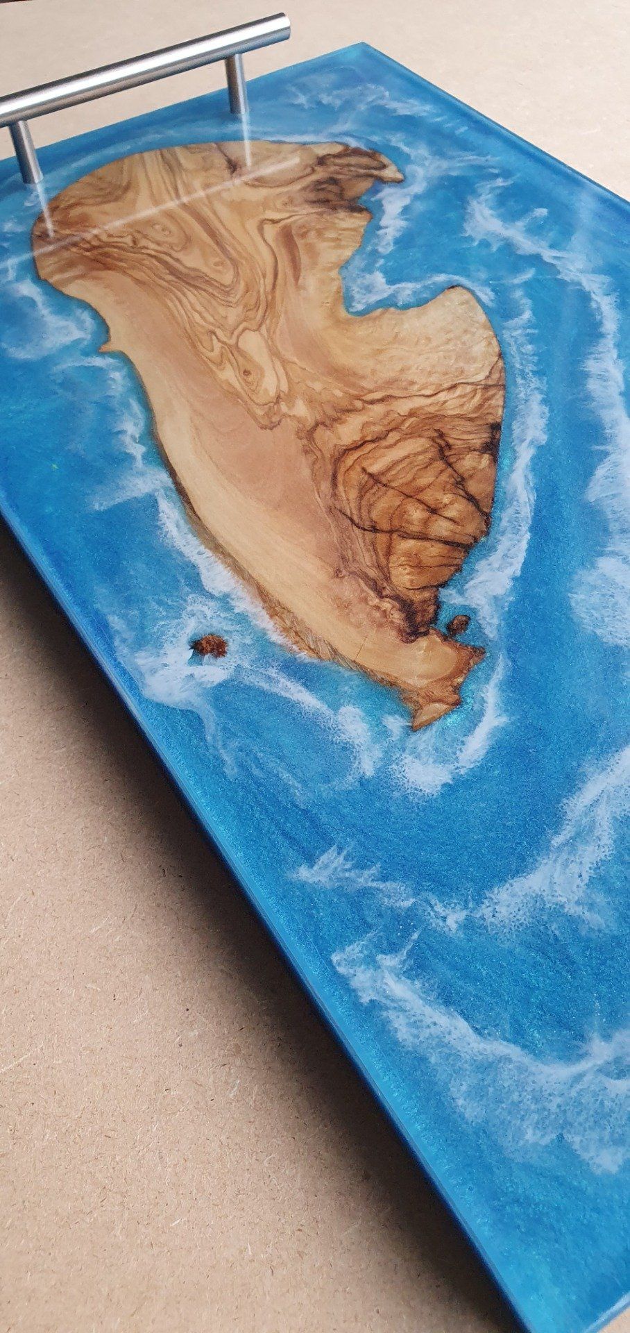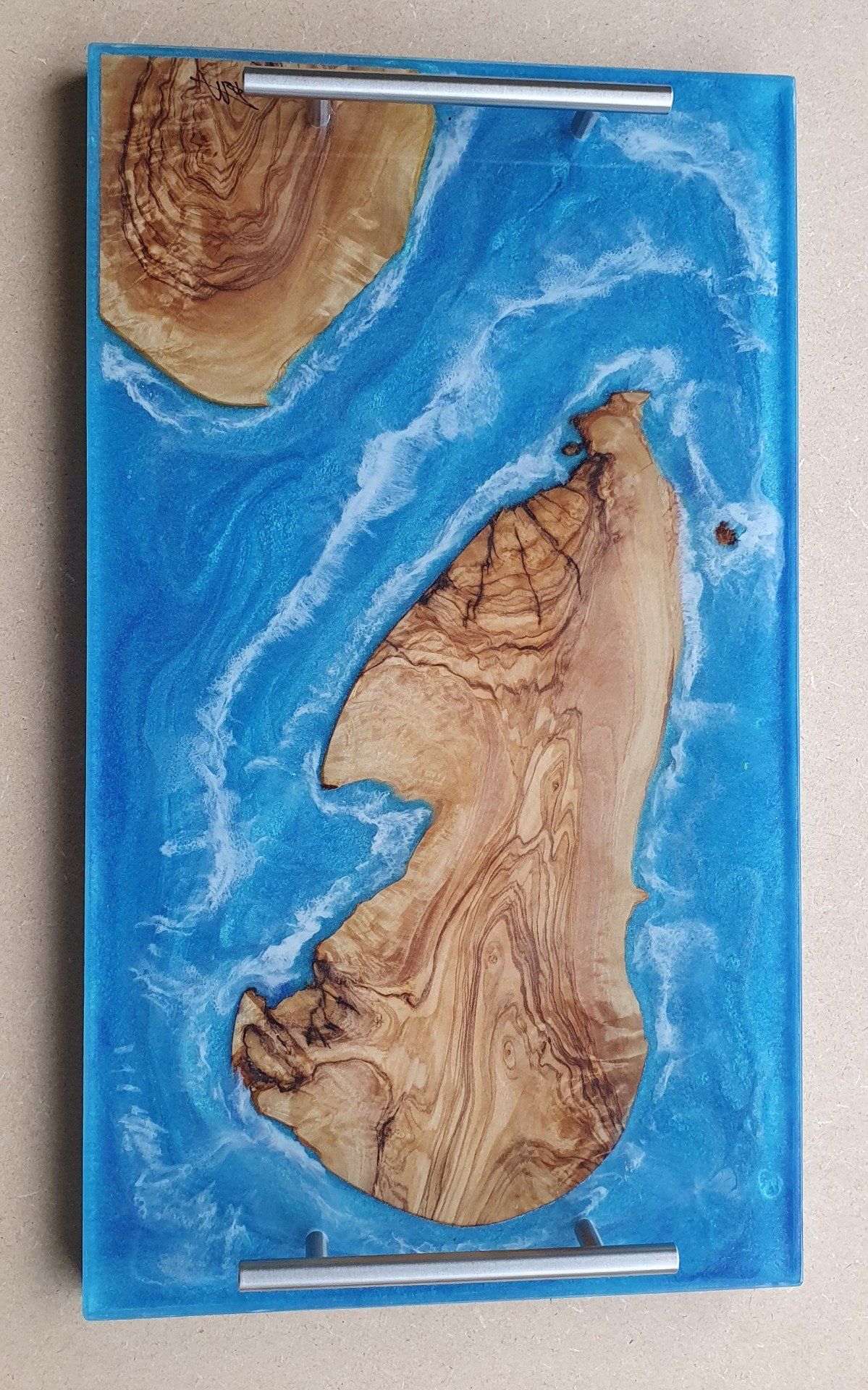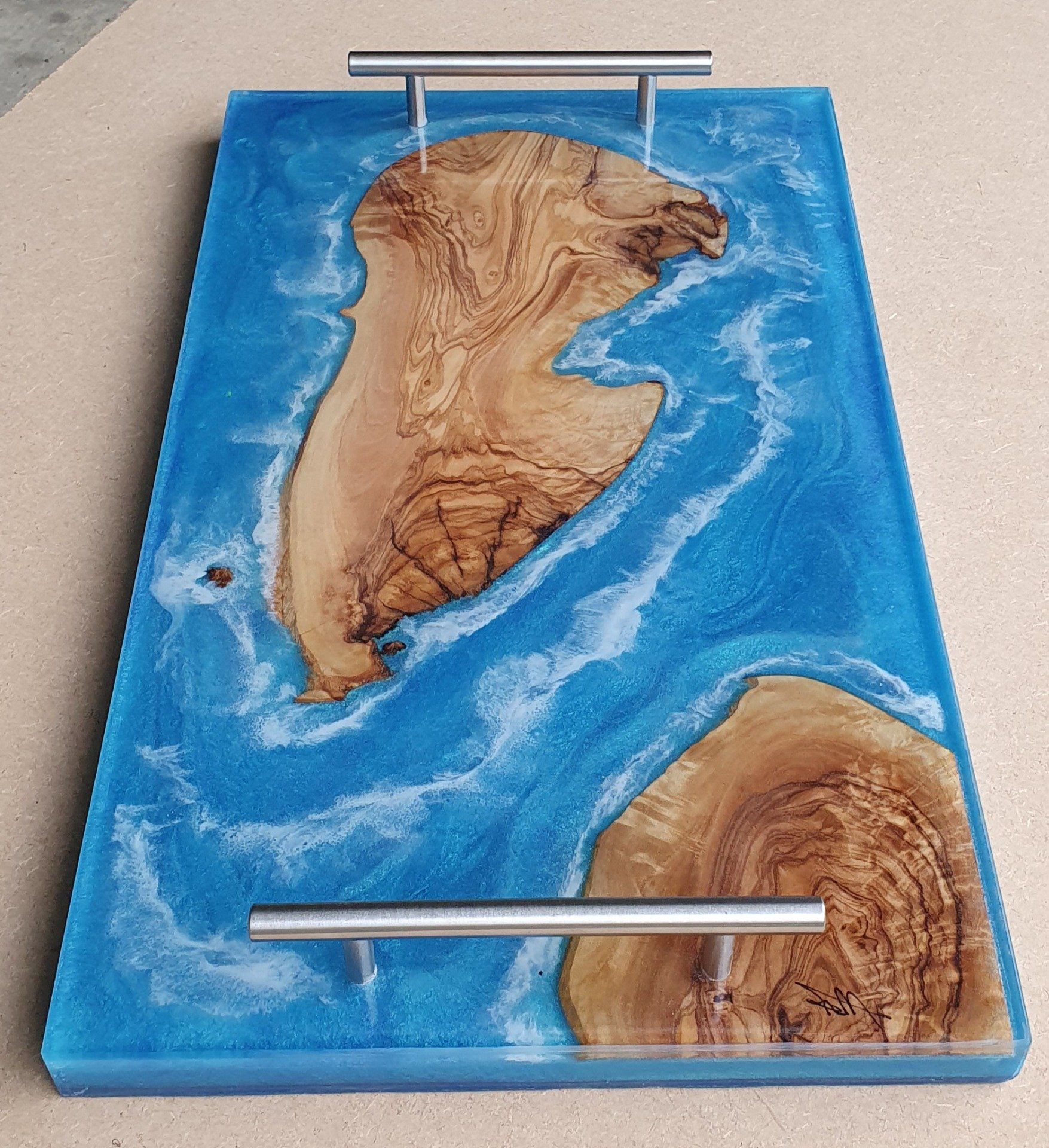 Plateau bois (chêne) et résine bleu océan. Un peu d'écume comme la mer.