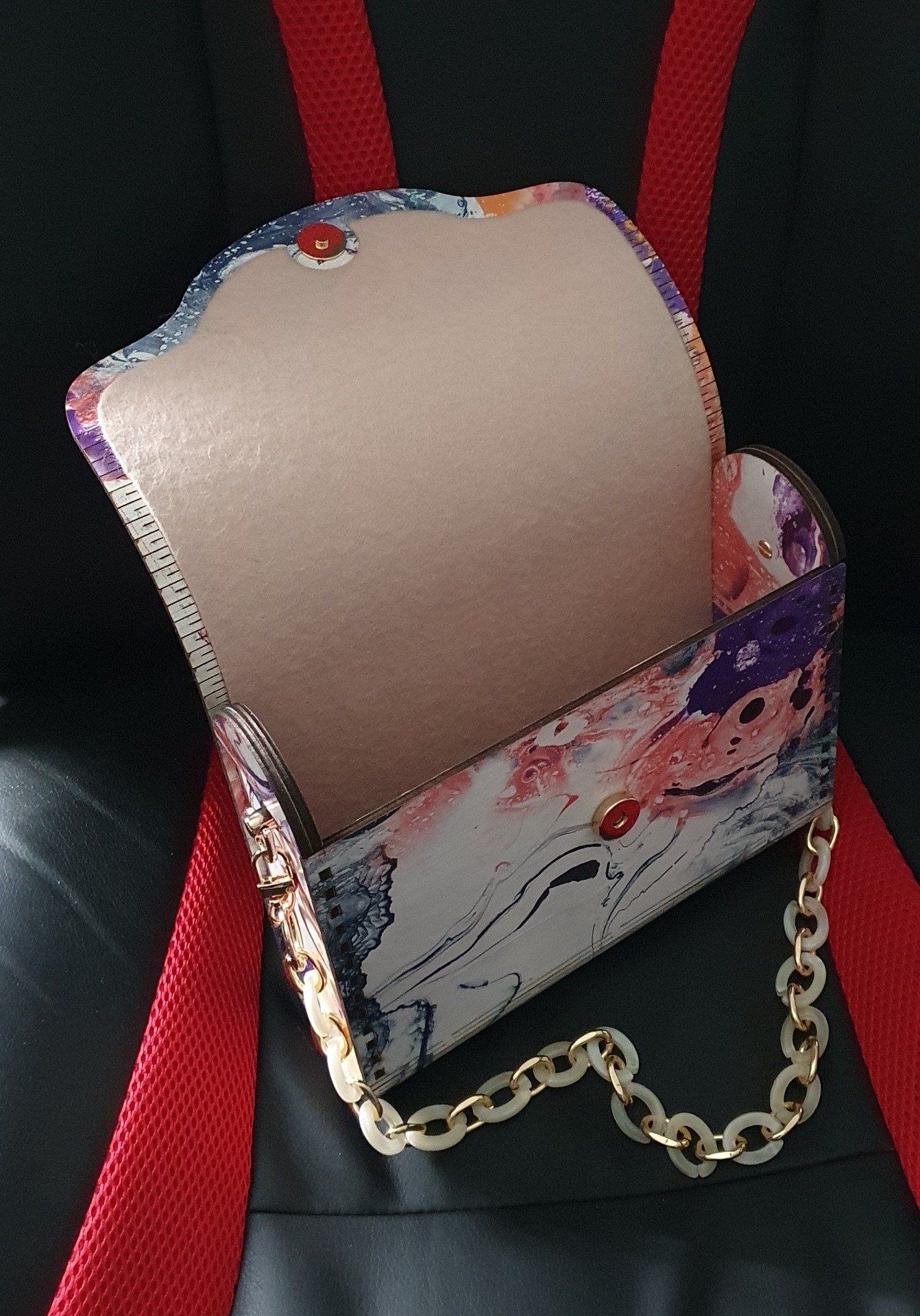 Joli sac à main en bois. Décor verni. Dimensions 225x180x60