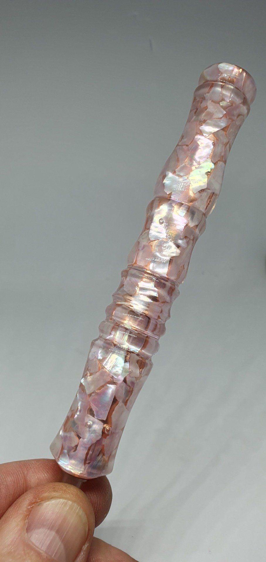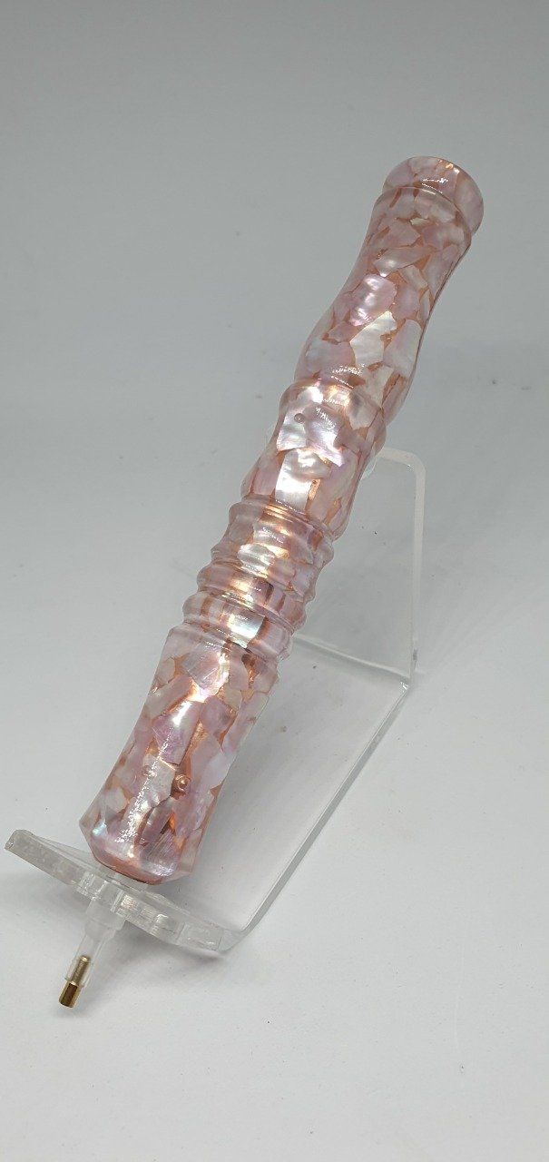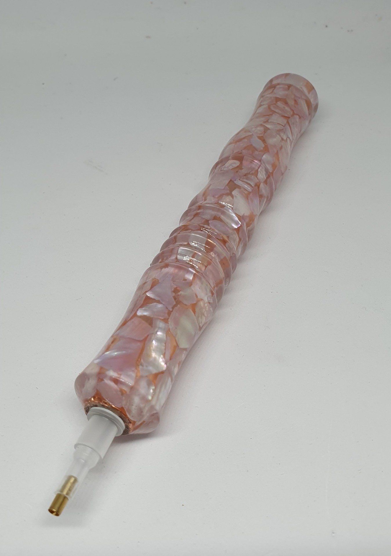 Magnifique stylo diamond painting en nacre rose. Des éclats de nacre collés sur un tube cuivré font de ce stylet un objet unique. Livré avec les deux embouts