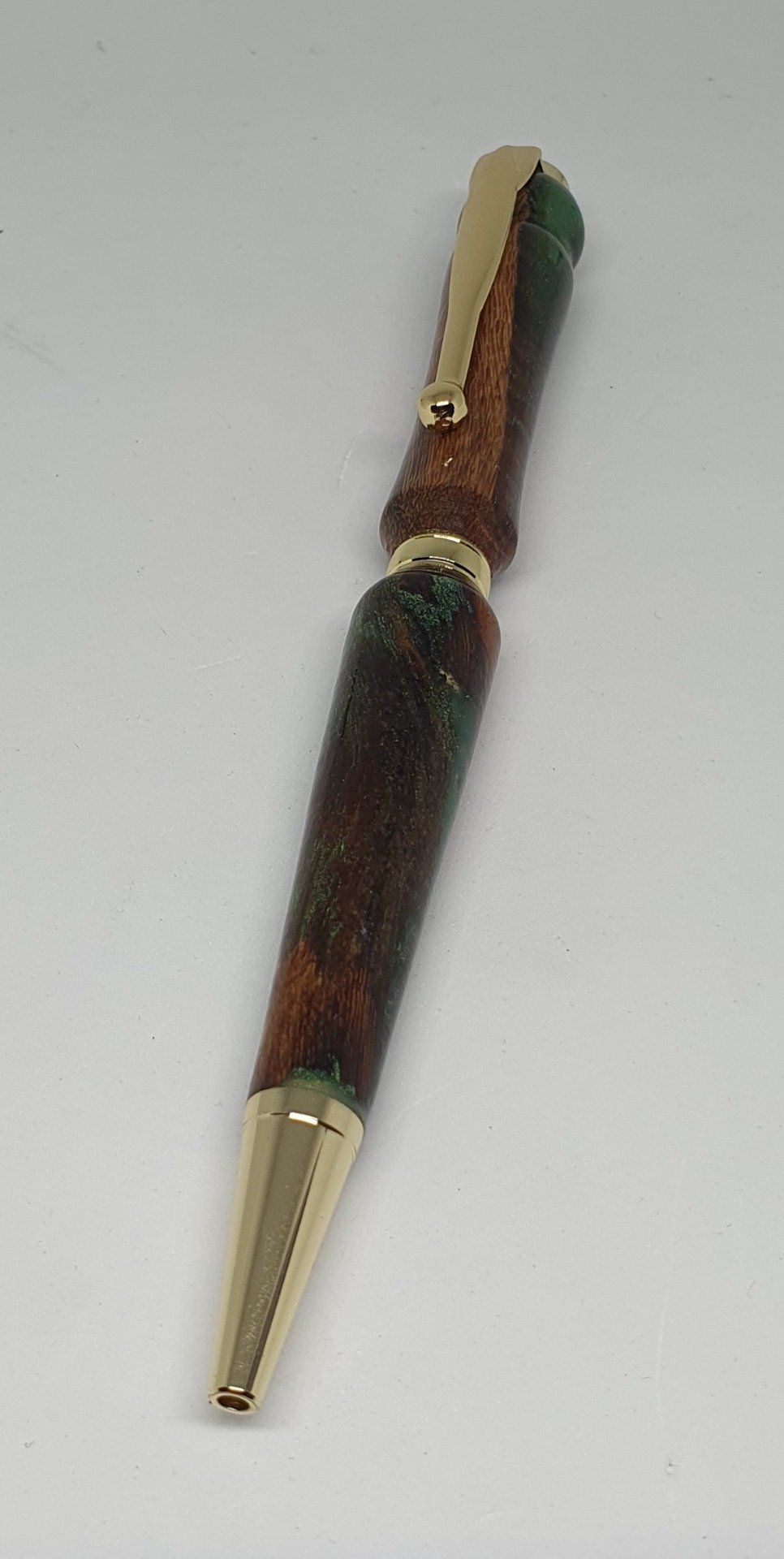 Joli stylo bille en Cep de vigne stabilisé résine verte. La résine imprégnée dans le bois rend ce stylo unique. Finition plaqué or. Recharge type Cross noire