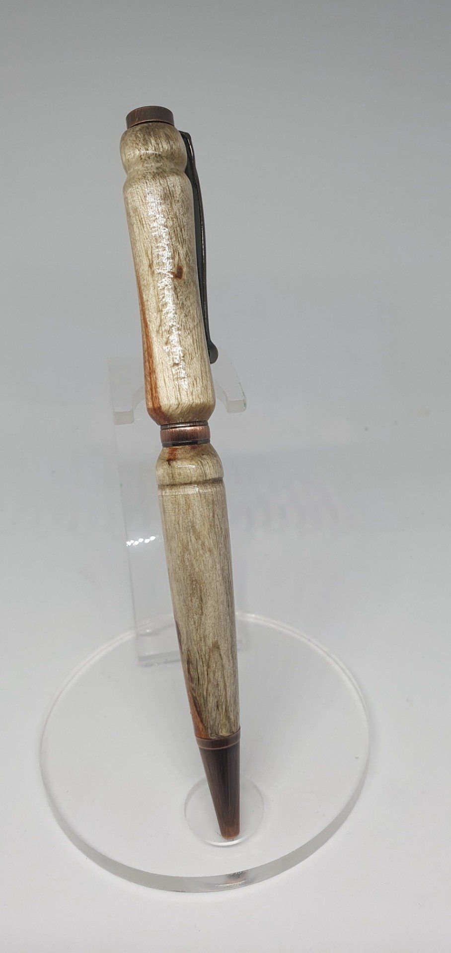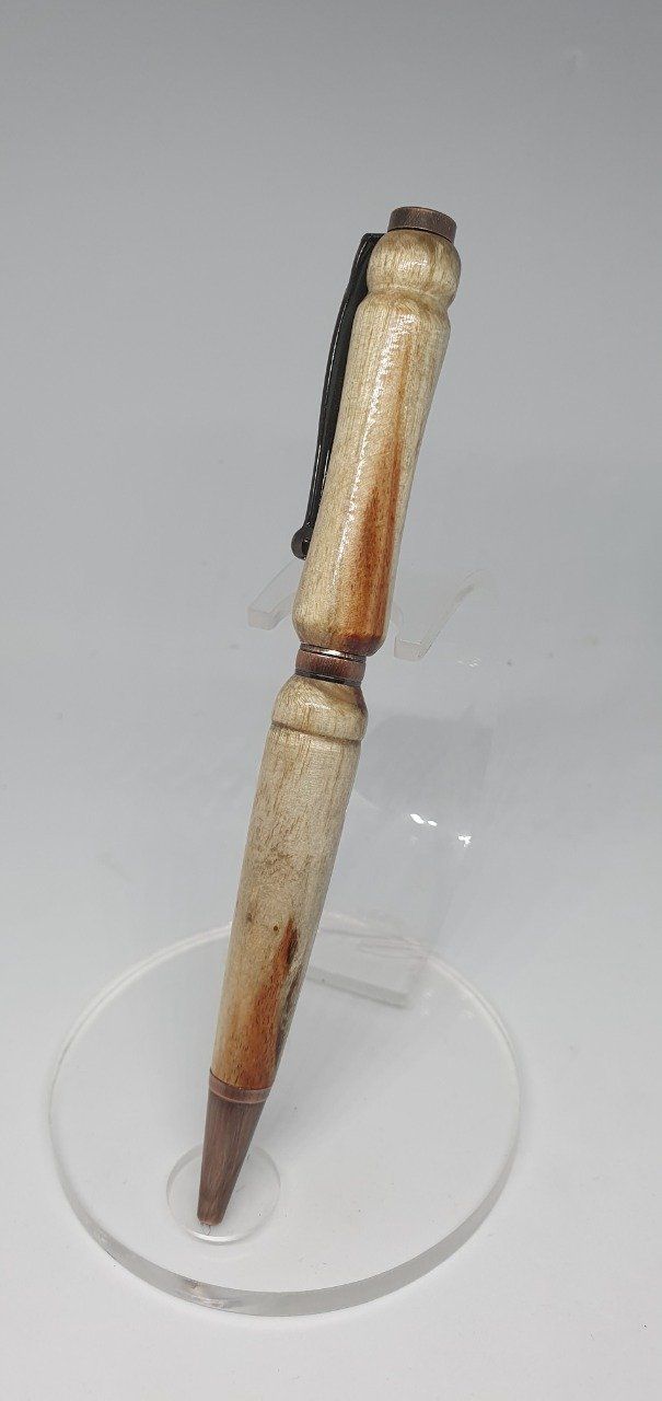 Superbe stylo bille en mimosa. Légèrement échauffé, les veines de bois apparaissent nettement. Finition cuivre vieilli. Recharge type Cross noire