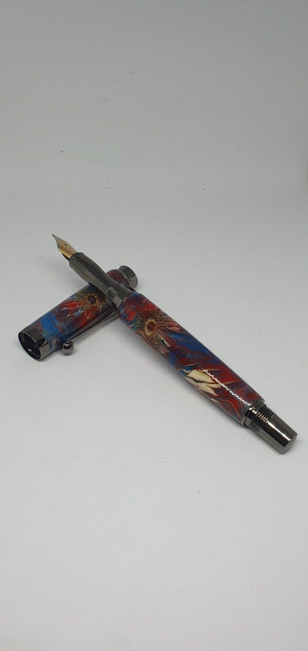 Des chardons dans la résine bleue et rouge donne à ce stylo un look unique. Finition gun métal. Plume fine allemande.
