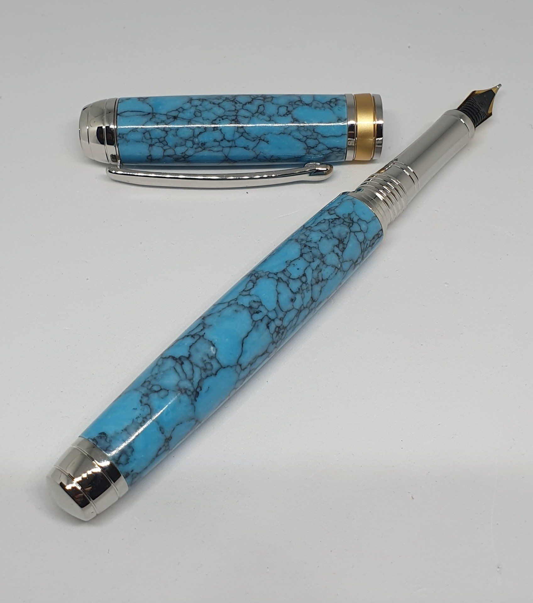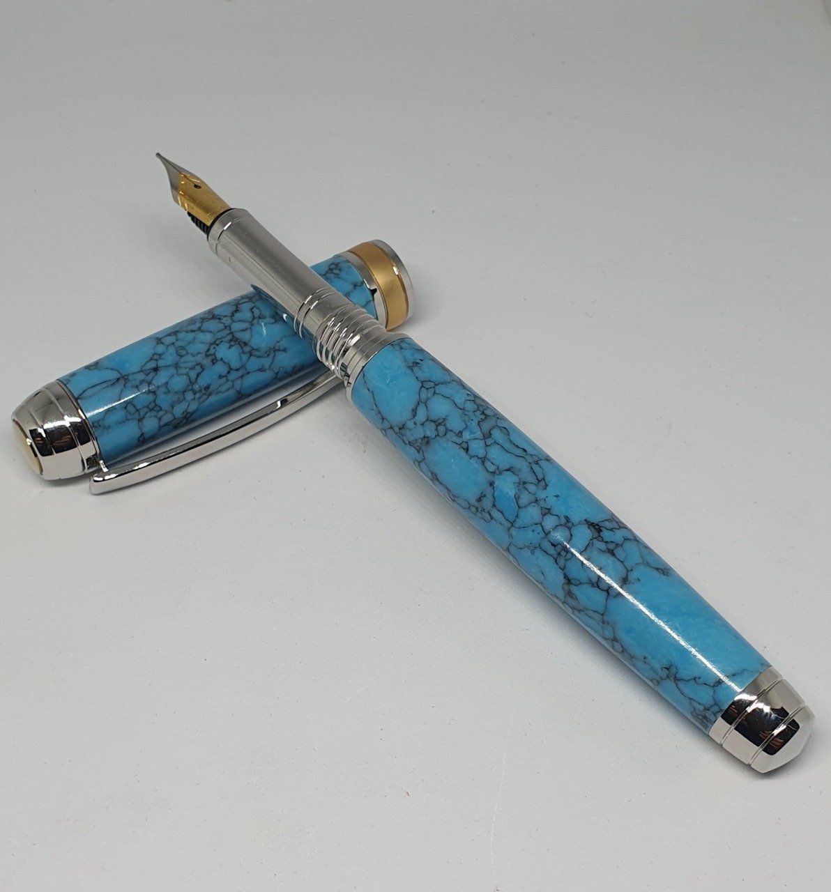 Stylo en pierre reconstituée "turquoise". Finition rhodium et plaqué or.
